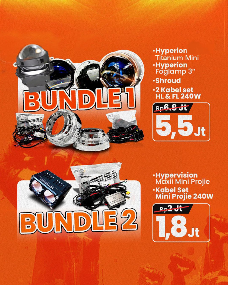Tak hanya itu saja, Tomy juga menawarkan pilihan program promo lainnya yakni bundling. Ada 2 pilihan yang disediakan, yakni Bundle 1. Program ini berisikan produk Hyperion Titanium Mini, foglamp Hyperion ukuran 3 inci, shroud, serta dilengkapi dengan 2 set kabel HL dan FL 240 Watt.